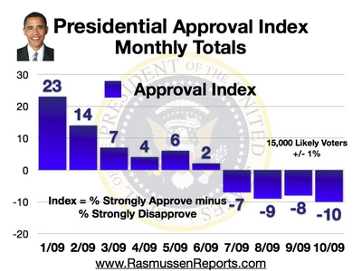Rasmussion Reports:"In October, for the third straight month, 39% Strongly Disapproved of the president’s performance. The number who Strongly Approved fell two percentage points to 29%, the president’s lowest full-month total to date. That leads to a Presidential Approval Index rating of -10, also a new low for Obama.